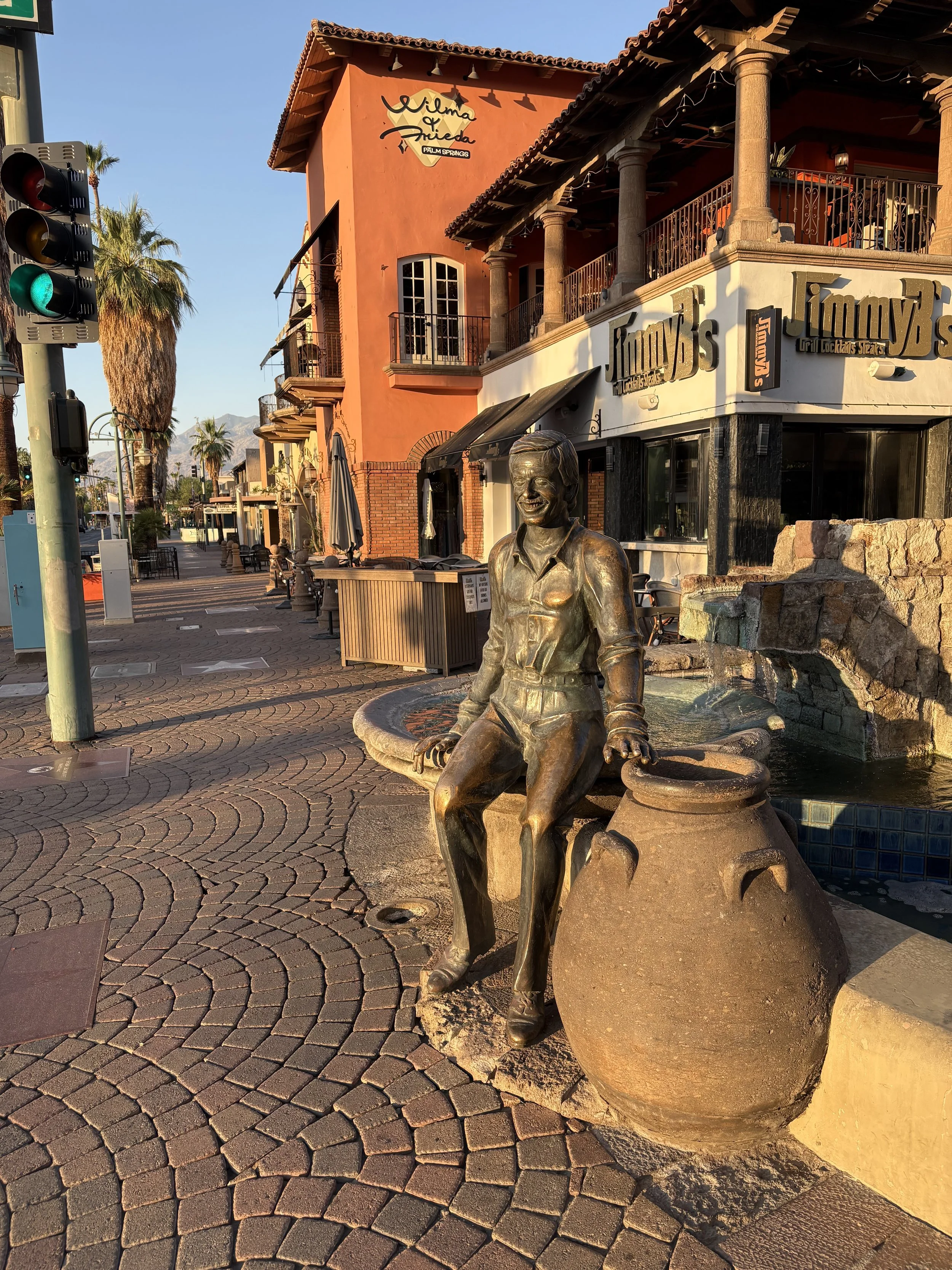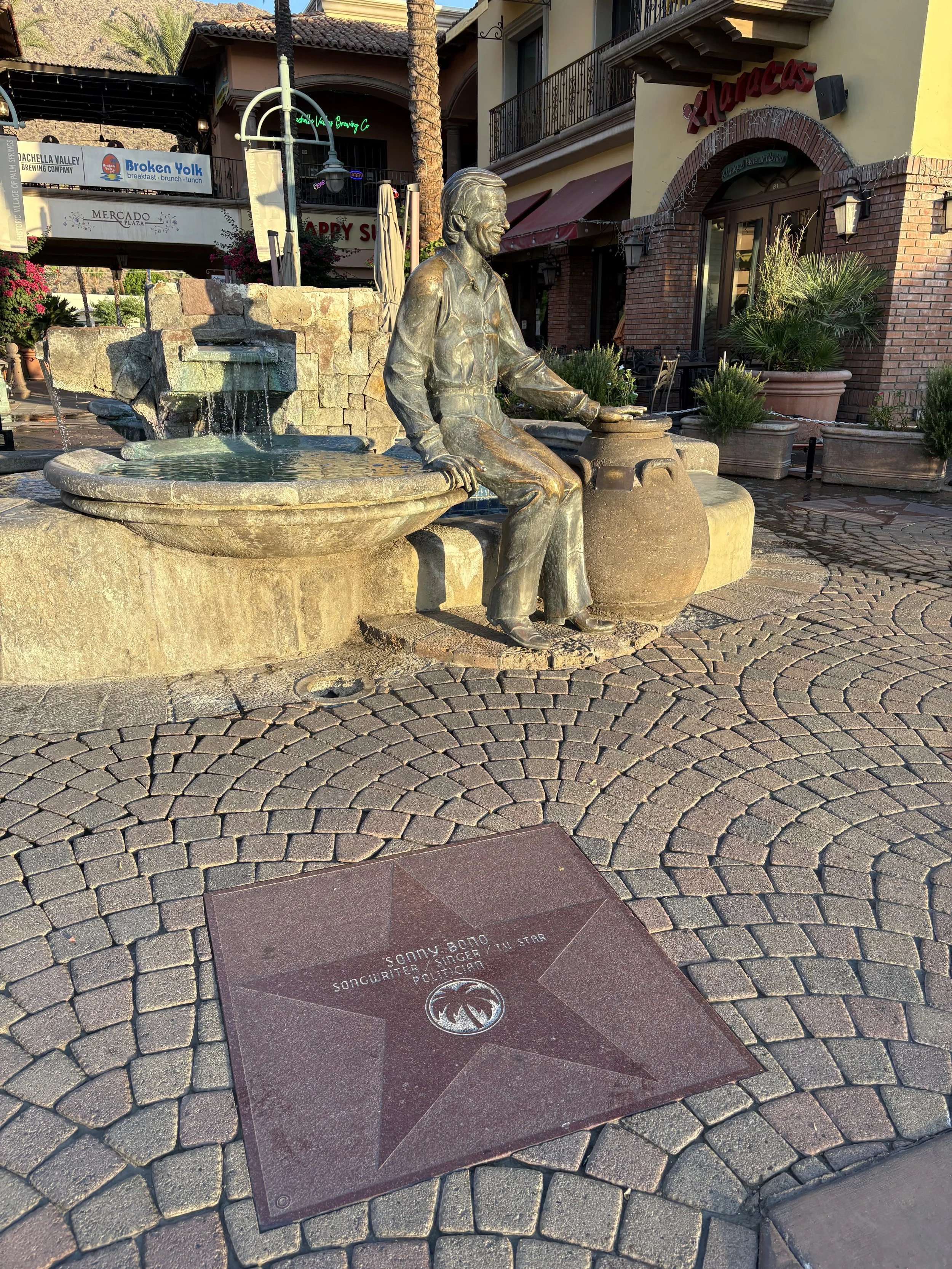 Downtown Location of Sonny bono statue and stars in tribute to celebrities Mid-Century Melee highlights The stars Displayed Throughout Palm SPrings recognizing The many contributors to The City, such as Sonny Bono.